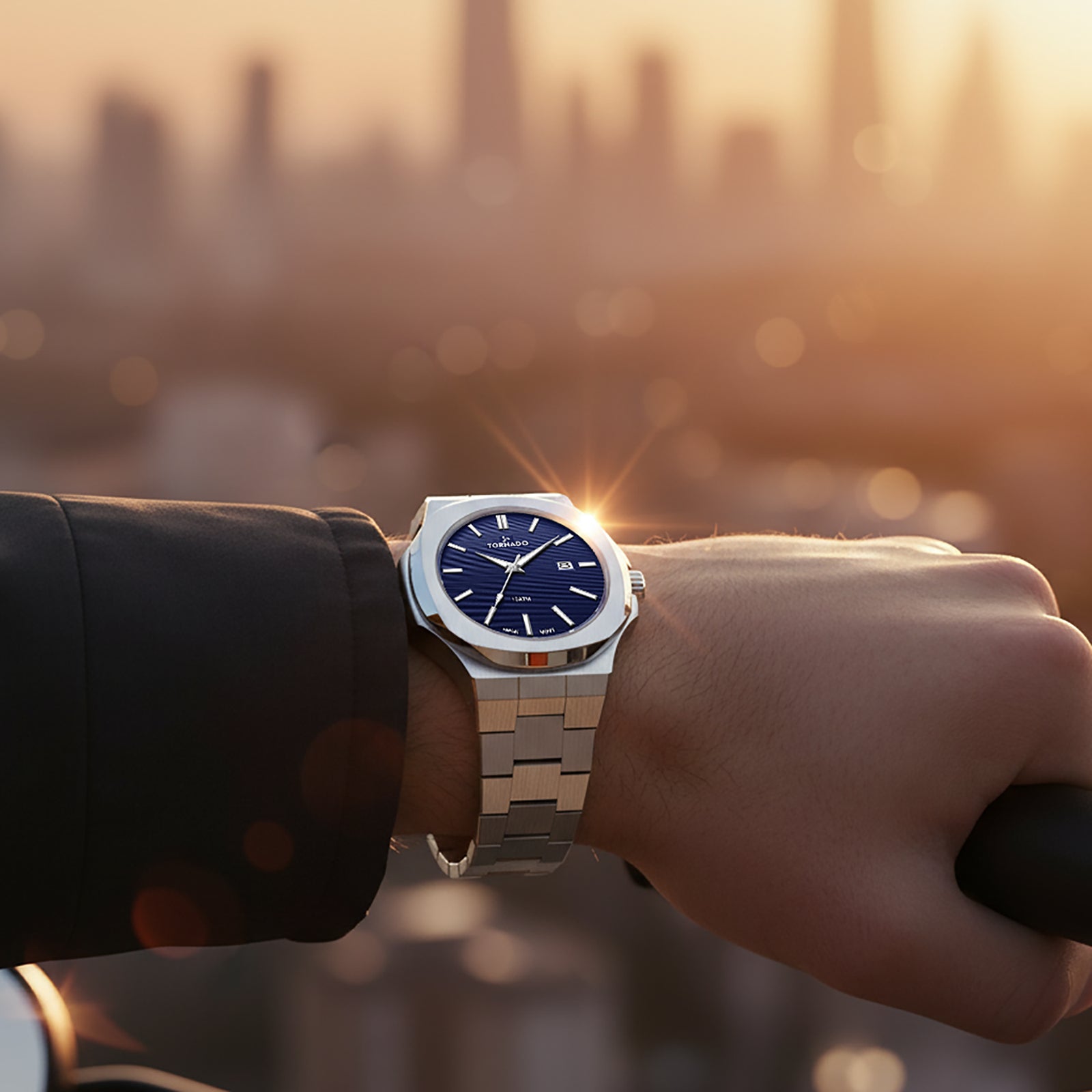 Tornado Aurora Eon's Watch with blue dial, silver stainless steel case and strap. Japan Quartz movement ensures accuracy. Sapphire glass protects dial. Water resistant 5ATM. 3-year warranty included.