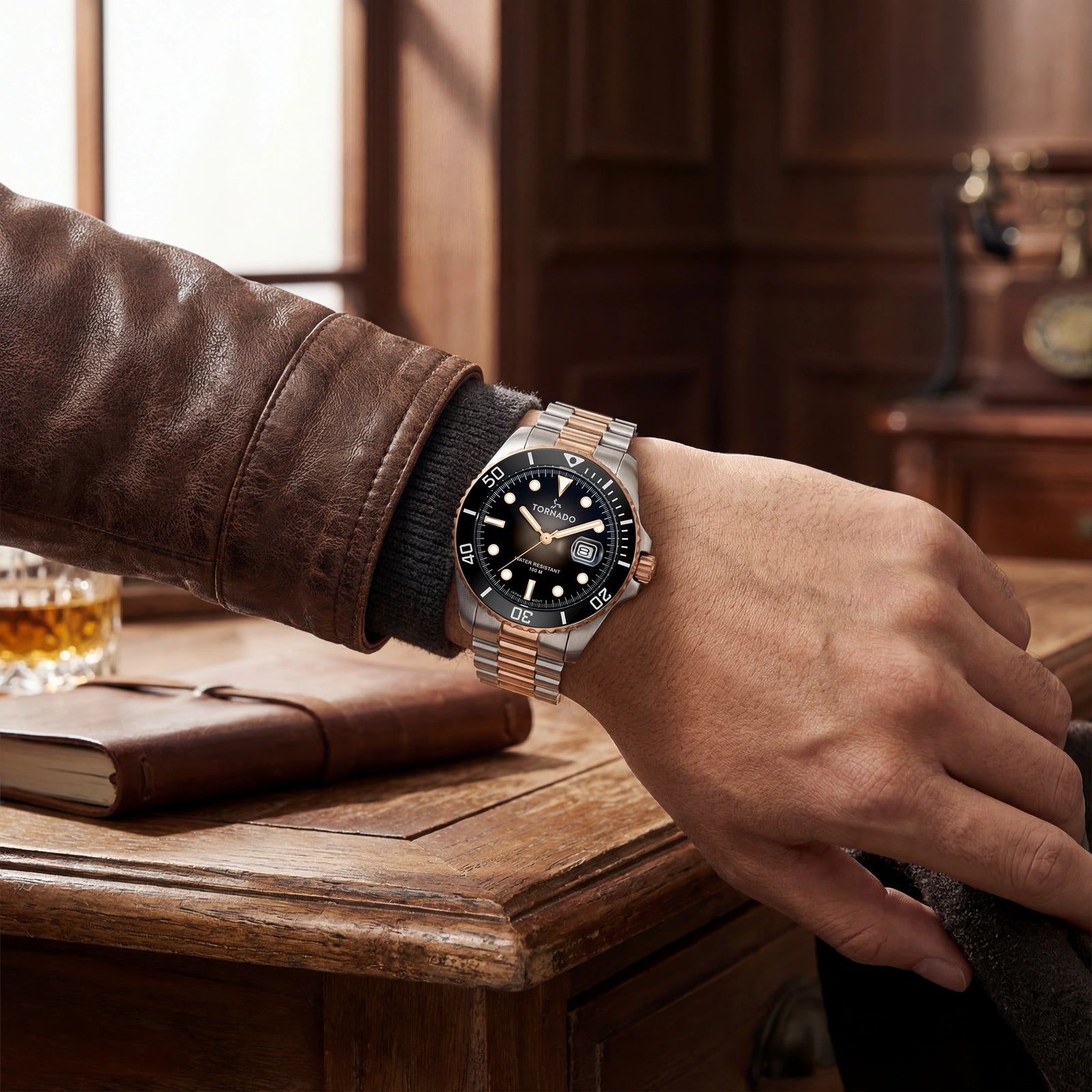 Steel and rose gold meet in a balanced, modern classic. The Tornado Lumina Analog men’s watch T22001-KBKB features a 42 mm 316L stainless-steel case with rose-gold-tone crown and bezel ring, a black ceramic unidirectional bezel with engraved scale, and a crisp black dial under a sapphire-coated crystal with a magnified date window at 3. Luminous hands and markers keep the read clear after dark. A smooth-draping two-tone presidential bracelet with push-button deployant clasp finishes the build, while the reliable Miyota 2115 Japanese quartz movement and 10 ATM (100 m) water resistance make it a refined luxury sport daily driver. Created for men who want polish with versatility—professionals, founders, grooms, graduates, and style-forward Millennials/Gen Z. The two-tone rose-gold & stainless-steel palette pairs effortlessly with navy or charcoal suits, white or light-blue shirts, cashmere knits, and weekend denim. Ideal as a wedding watch, business watch, or gift for him; a timeless men’s two-tone rose gold watch that travels from office to black-tie to casual nights out with ease.