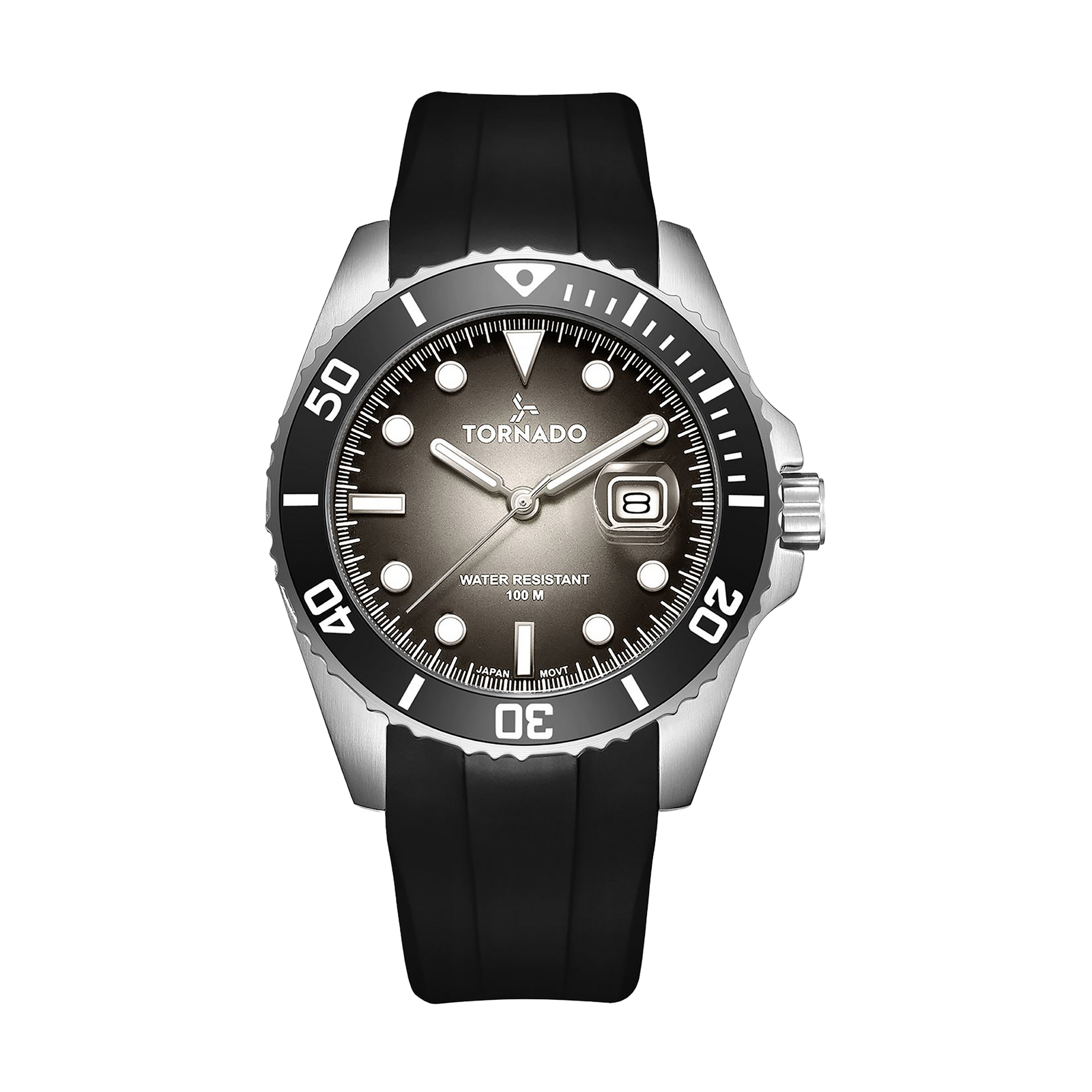 Classic dive DNA, modern monochrome. The Tornado Lumina analog men’s watch T22001-SSBB focuses on construction: a 316L stainless-steel case, a ceramic unidirectional bezel that turns with a confident click, and a sapphire-coated crystal over a refined smoke-grey/black gradient dial. A magnifying date boosts legibility at a glance, while bright lume keeps it readable after dark. Inside, the proven Miyota 2115 Japanese quartz movement runs quiet and precise—set it, wear it, forget it. Made for motion—and made to last. The black silicone strap wears light at the gym, on a run or ride, and looks sharp with weekend tees, hoodies and denim. Dress it up with a knit polo or button-down for casual Fridays. With 10 ATM water resistance and a 3-year warranty, it’s the luxury sport watch you can count on from commute to campsite and back again.