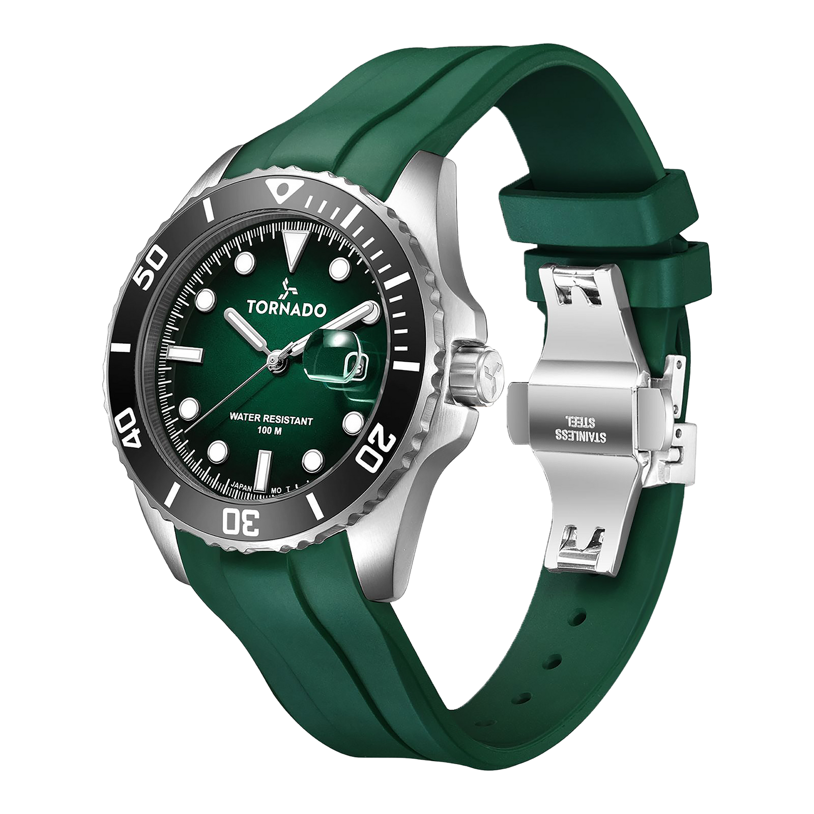 Sport-forward comfort with classic dive cues. The green dial and rotating ceramic bezel sit under a sapphire-coated crystal with a magnified date; luminous markers stay readable in low light. A sweat-friendly smooth silicone strap keeps it light for running, gym and weekends.Built for active days and city nights, this 10 ATM water resistant men?s watch is accurate, durable and easy to wear. Backed by a 3-year warranty.