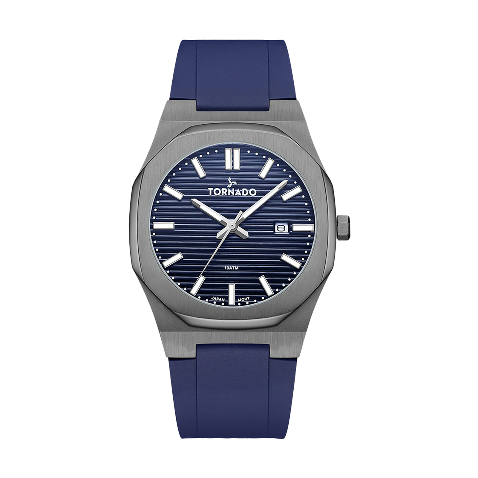 Tornado Spectra's Watch features blue dial, gunmetal case, and blue silicone strap. Powered by Japan Quartz movement, mineral glass protection, 10ATM water resistant. 3-year warranty included.