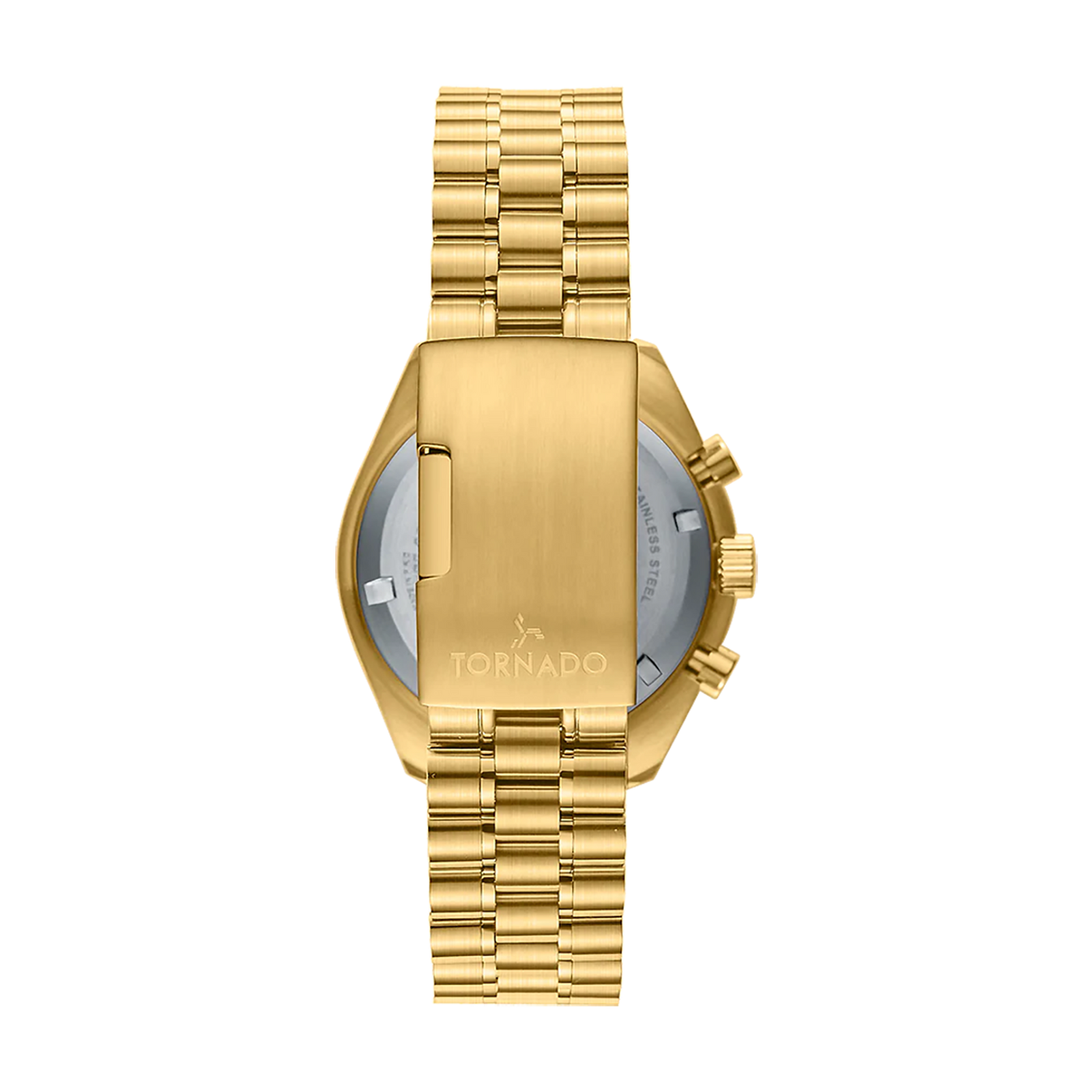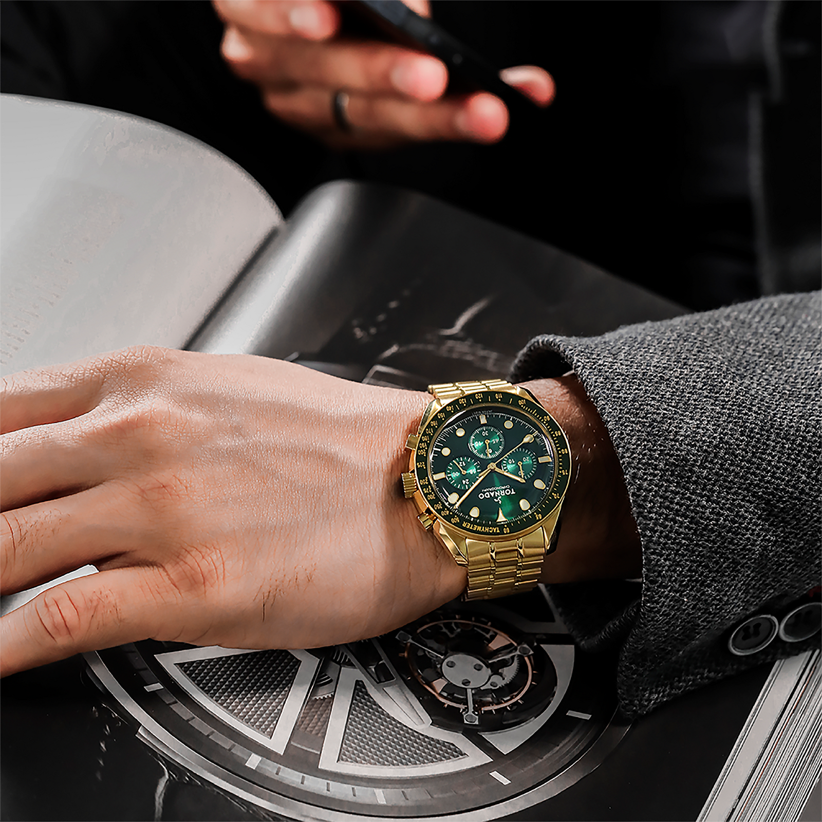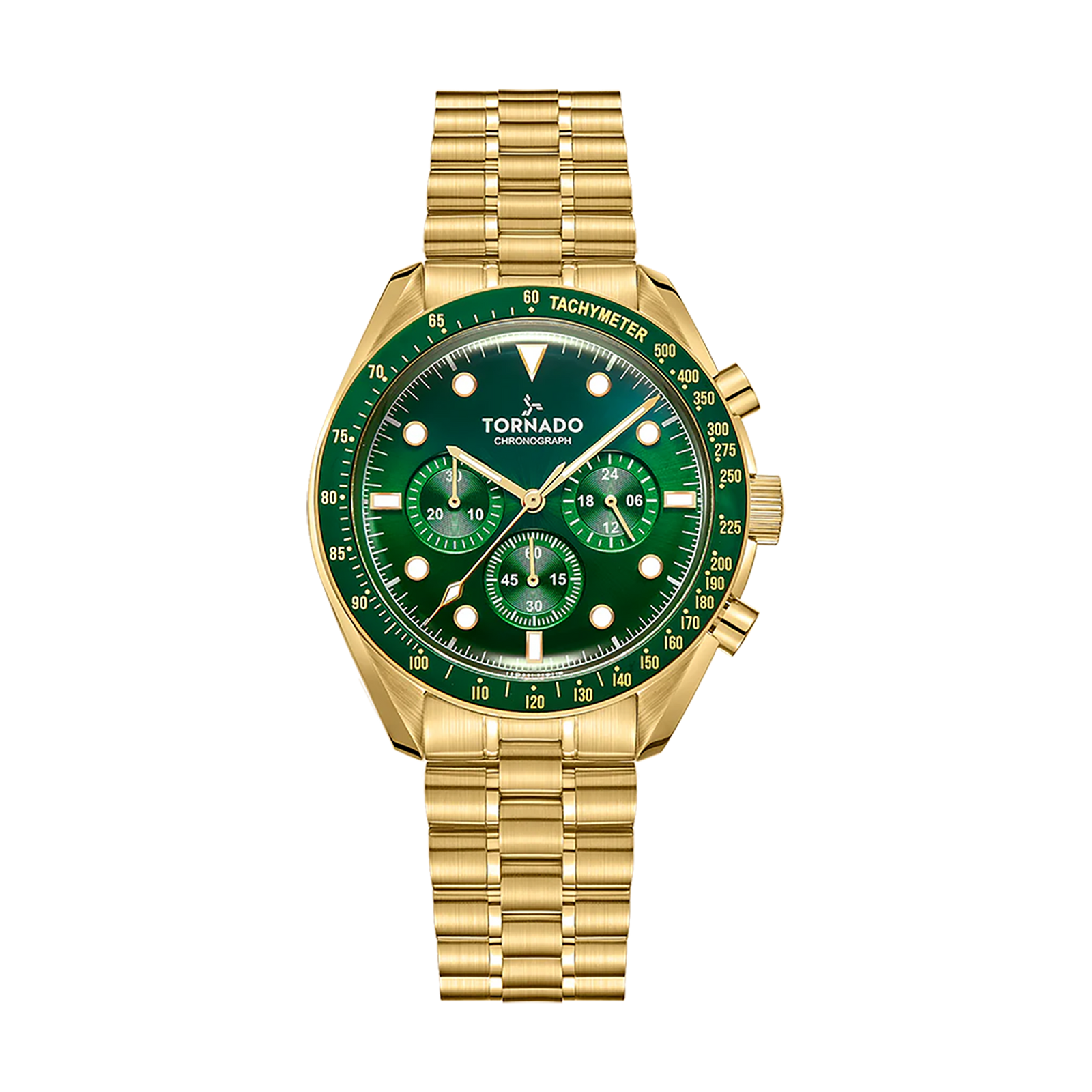 Tornado Cosmic Chrono Men's Watch with green dial, gold case, and strap. Powered by Miyota JS20 chronograph movement. Radian double dome sapphire coated glass. 5ATM water resistant. 3-year warranty included.
