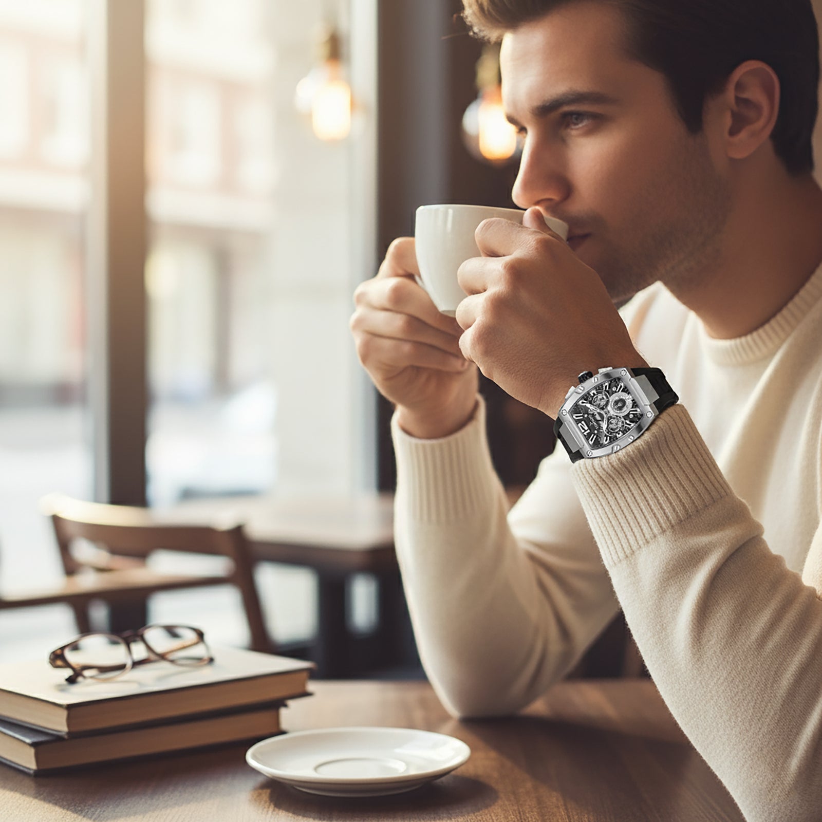 Minimal, versatile, elevated. A brushed-silver stainless steel tonneau case and layered partial-skeleton dial bring clean sport-lux lines. The sapphire-coated crystal resists scratches and luminous markers enhance durability and legibility. A flexible black silicone strap keeps the profile wearable all day. The multifunction Japanese quartz movement adds day/date utility in a slim profile. From office casual to off-duty, it pairs with everything?white shirts, navy tailoring, gray knits and dark denim. 10 ATM water resistant and a 3-year warranty round it out.