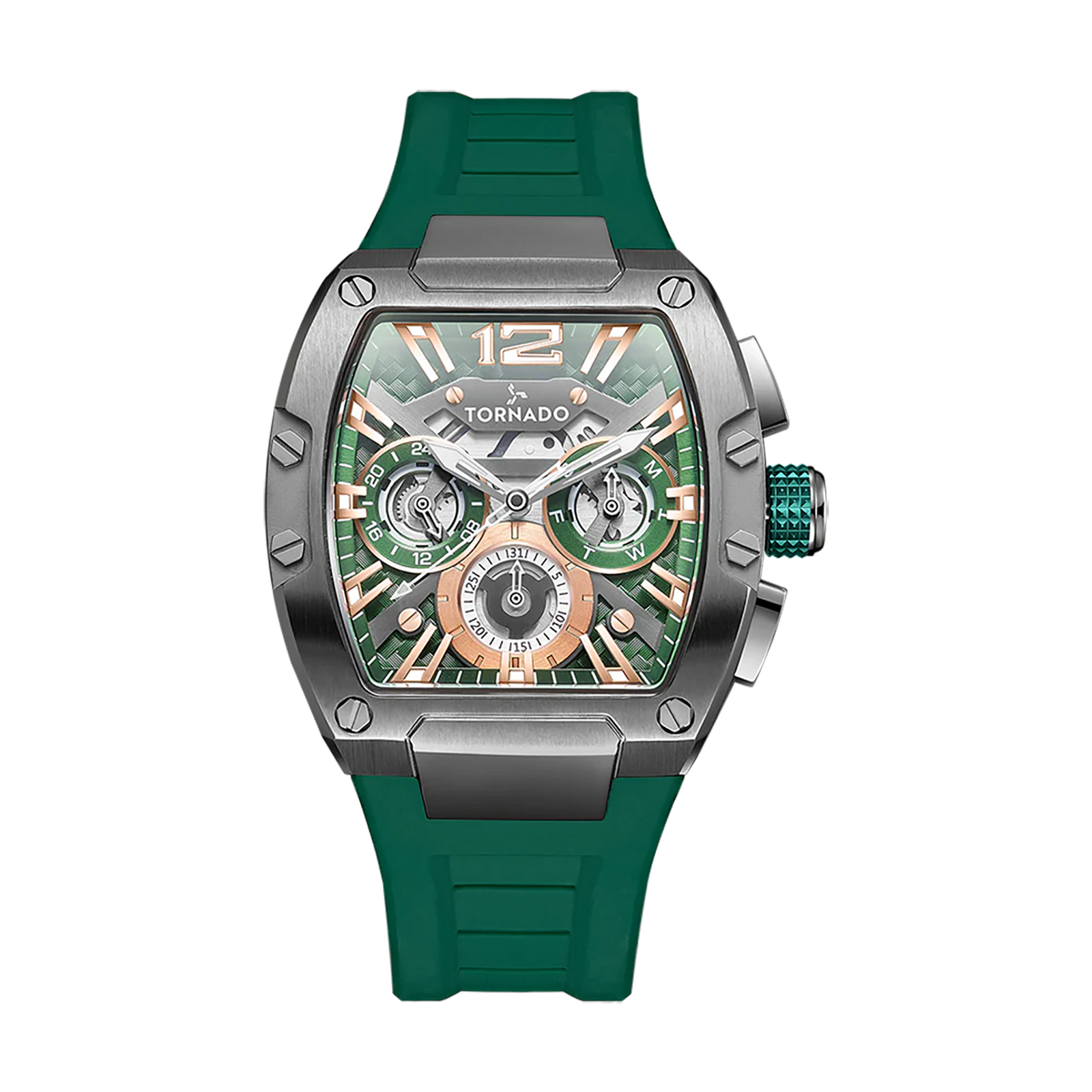 Color with composure. Tornado Xenith’s green strap and rose-gold accents elevate the sport profile into something quietly luxurious. The sapphire coated glass and 316L brushed finish stainless steel hold a premium sheen; lume keeps it readable after hours. The engine is pure reliability: Japanese precision quartz multi function movement. Where it fits. University projects to client lunches—pair with black, heather grey, tan/stone/cream and denim; rose-gold jewelry or hardware completes the palette. A tasteful tornado mens watch for university students, young professionals and older men who want color with class.