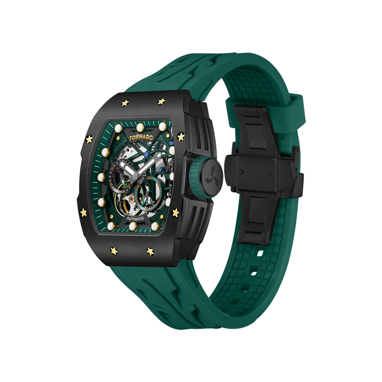 Quiet power with a refined edge: a black-brushed stainless steel tonneau case punctuated by gold screws surrounds a skeleton dial where the japanese automatic movement Miyota 82S7 breathes beneath a sapphire-coated crystal. The deep-green silicone strap adds richness without weight, and at 39 mm the case feels substantial but composed. Luminous markers and a butterfly clasp round out the luxury experience. This is the colorway for style leaders, creatives, entrepreneurs and mature dressers who want modern sport and classic taste in one piece. It slots into office and evening wardrobes—black, white, charcoal, olive, stone/cream and denim all sing with the green strap; gold hardware or jewelry ties it together. With 10 ATM water resistance, it’s ready for everyday weather and short swims—save the dives for another watch.