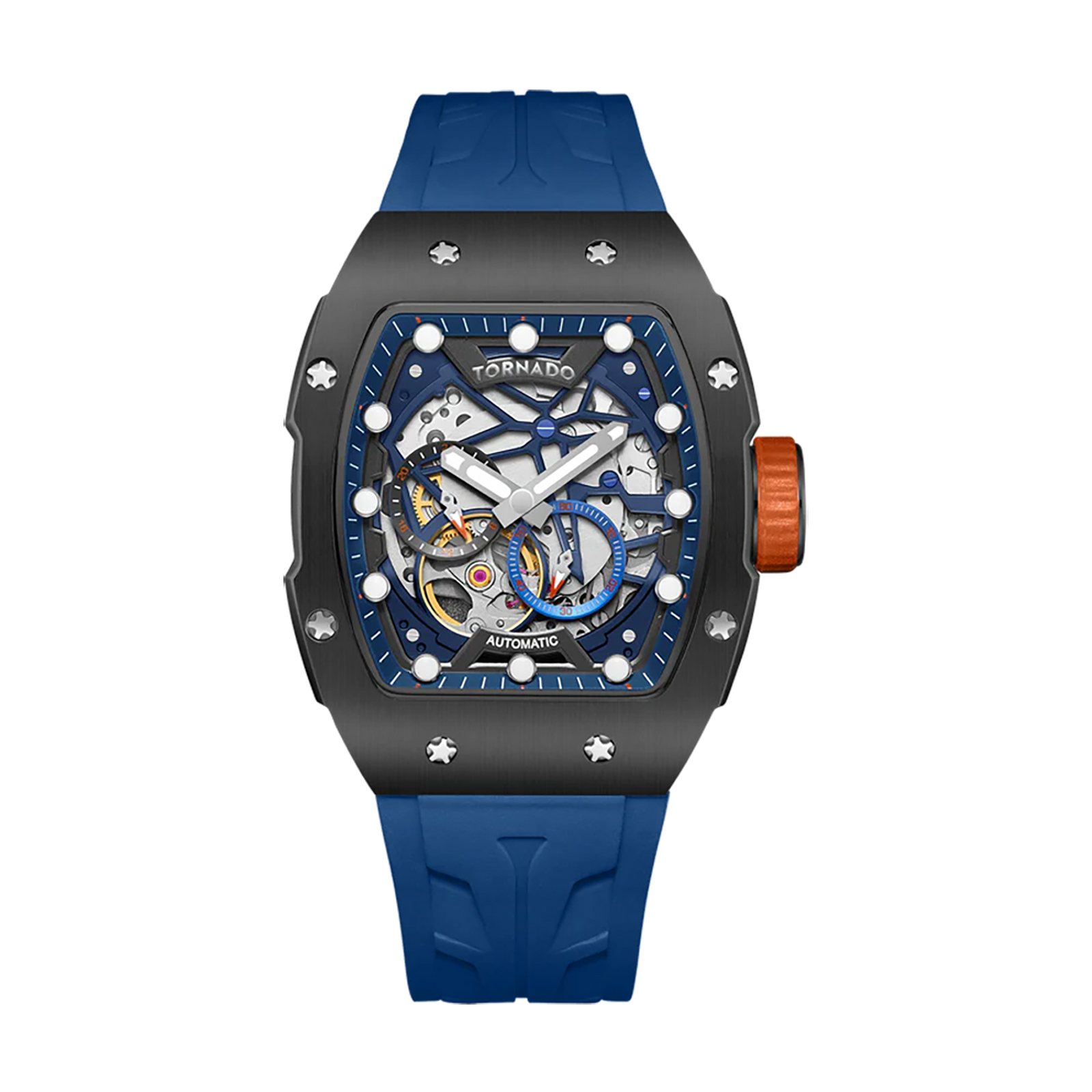 Mechanical rhythm on your wrist. Midnight blue meets gunmetal in a dark-brushed 316L stainless steel tonneau case that frames an open-worked skeleton dial with blue highlights and a subtle red accent crown. The Miyota 82S7, this Japanese automatic watch moves in full view beneath a sapphire-coated crystal, while luminous markers keep it readable after hours. Sized at 39mm, it’s assertive without shouting, and the butterfly clasp keeps the watch centered and comfortable all day. From soundcheck to cocktails, lecture hall to pitch meeting, it plays well with white or light-blue shirts, charcoal or black tees, navy suiting, leather jackets, and black or indigo denim. Made for musicians, creatives, young founders, and design-forward professionals who want art and engineering in one piece. Water resistance: 10 ATM (100 m)—ready for rain, splashes, and short swims; avoid hot water and diving.