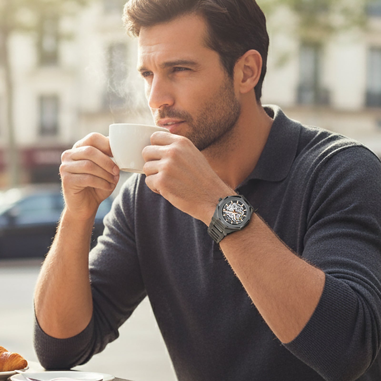 Automatic skeleton watch with grey dial and integrated stainless steel bracelet. Features Seiko NH70 movement, sapphire-coated glass, octagonal bezel, and 10 ATM water resistance.