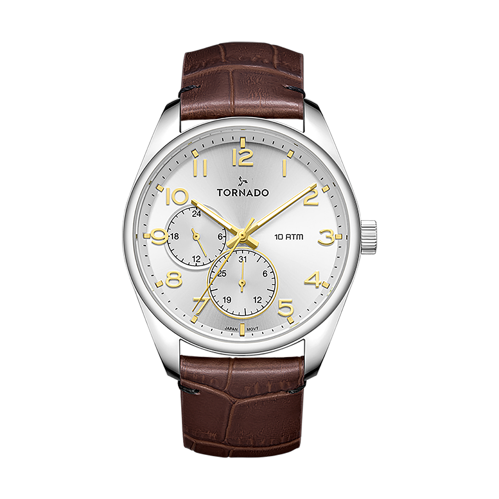 This CELESTIA CLASSIC variant sports a 42 mm round case crafted from 316L stainless steel and finished in a muted silver, giving the watch a classic elegance. The white dial carries a smooth sunburst finish that catches light subtly, paired with well-defined Arabic numerals for clear legibility. The multi-function layout is arranged with care, adding practical complication displays without crowding the dial. A sapphire-coated crystal protects the face, preserving clarity while offering improved resistance to scratches. Inside, the Seiko VX7R quartz movement drives the watch with reliable accuracy and stable multi-function performance. Water resistance is rated at 10 ATM, making it suitable for daily wear and routine exposure to water without concern. A brown genuine leather strap embossed with a crocodile pattern completes the design, adding warmth and a traditional touch against the silver case and white dial. The strap secures with a classic tang buckle for a clean, familiar fit. The watch is backed by a three-year warranty, reflecting confidence in its construction and long-term durability.