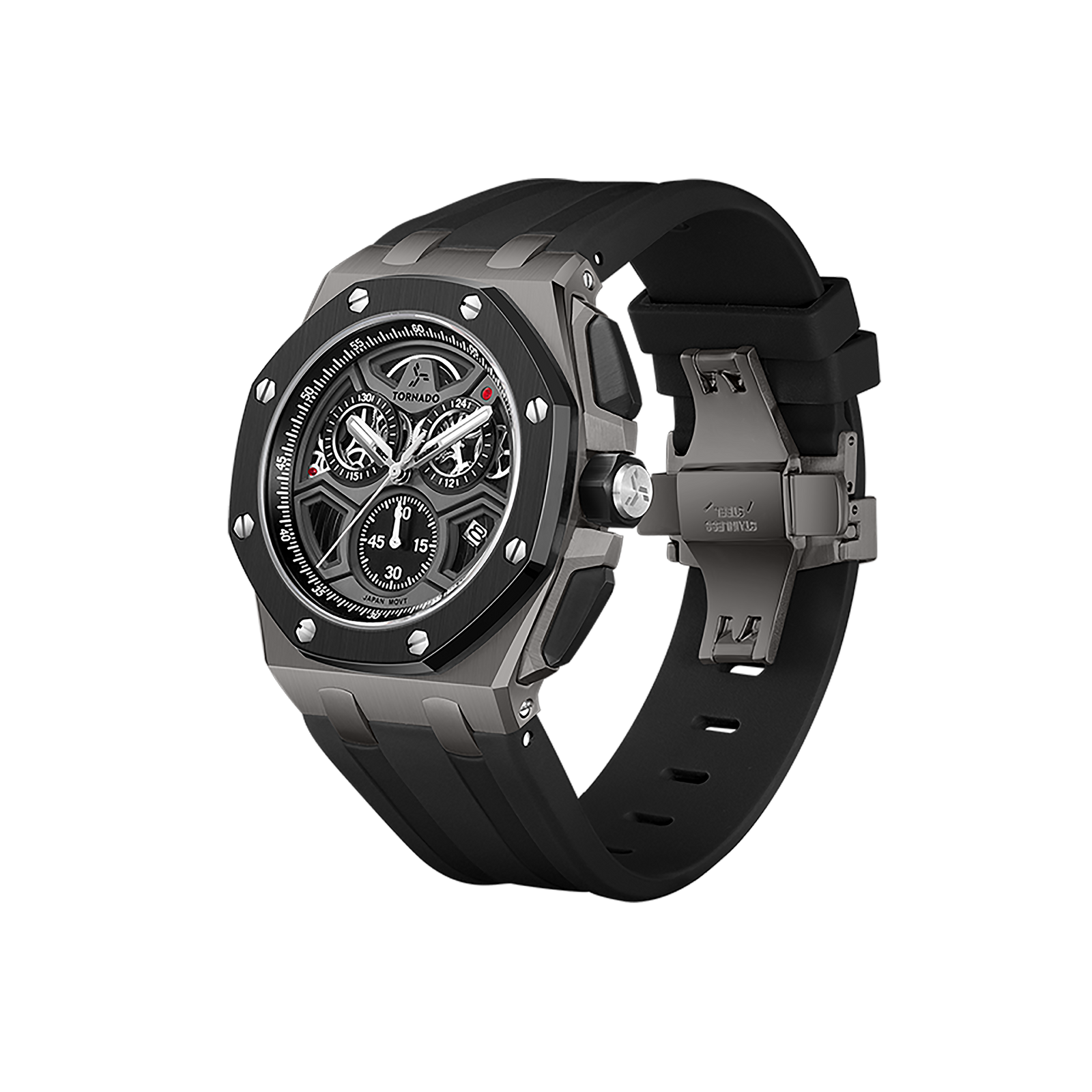 The LUMINA CHRONOSPHERE is built around a 43 mm case crafted from 316L solid stainless steel, finished with a combination of brushed and polished surfaces that give the watch depth without visual clutter. The round case is sharpened by an octagonal bezel, while a sapphire-coated glass protects the dial. The dial itself is finished in black and laid out to support the chronograph display. It is driven by the Miyota JS05 movement, a dependable chronograph calibre that delivers precise timekeeping and functional stopwatch performance. With a water resistance rating of 10 ATM, the watch is well suited to daily use and active settings, providing confidence beyond occasional splashes. Completing the design is a black silicone strap selected for flexibility, durability, and comfort over extended wear. The strap integrates cleanly with the case and secures with a butterfly buckle. Measuring 28x24 mm, the strap balances the watch’s substantial case, which measures 12.5 mm in thickness. Finished with a three-year warranty, the Lumina Chronosphere reflects a considered blend of sport-driven construction and refined case detailing.