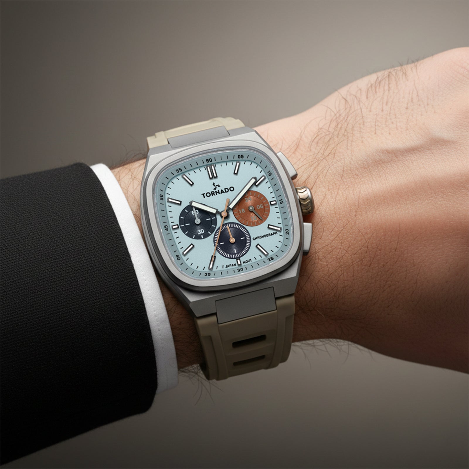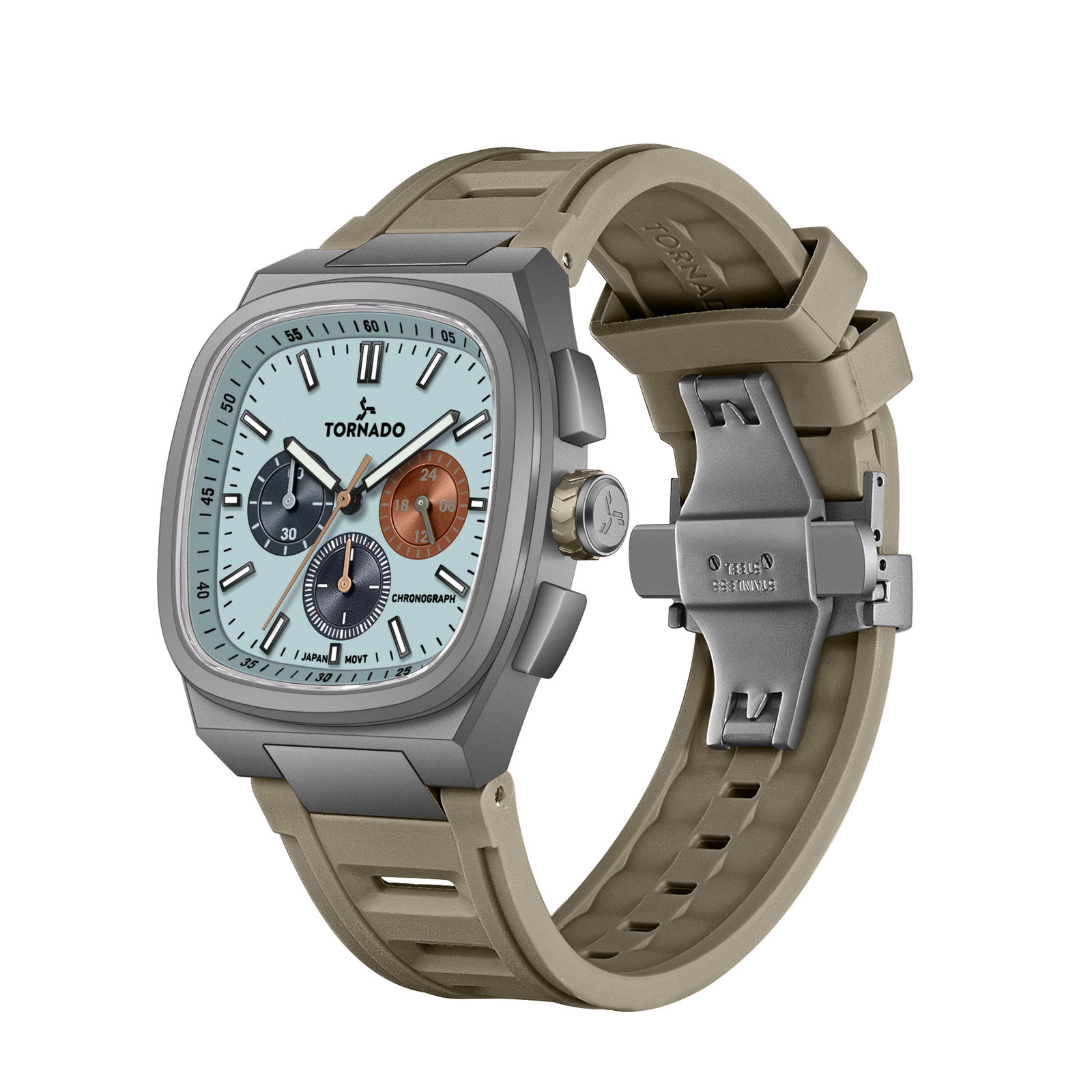 The Gunmetal Aristocrate presents a bold, technical look built around a 42 mm gunmetal square case crafted from solid 316L stainless steel. The sand blasted case is reinforced with a scratch-resistant coating, giving the case a modern tool-watch character. The blue dial provides strong contrast and clear legibility, under sapphire crystal. The khaki rubber strap is flexible, resilient, and secured with a butterfly clasp.