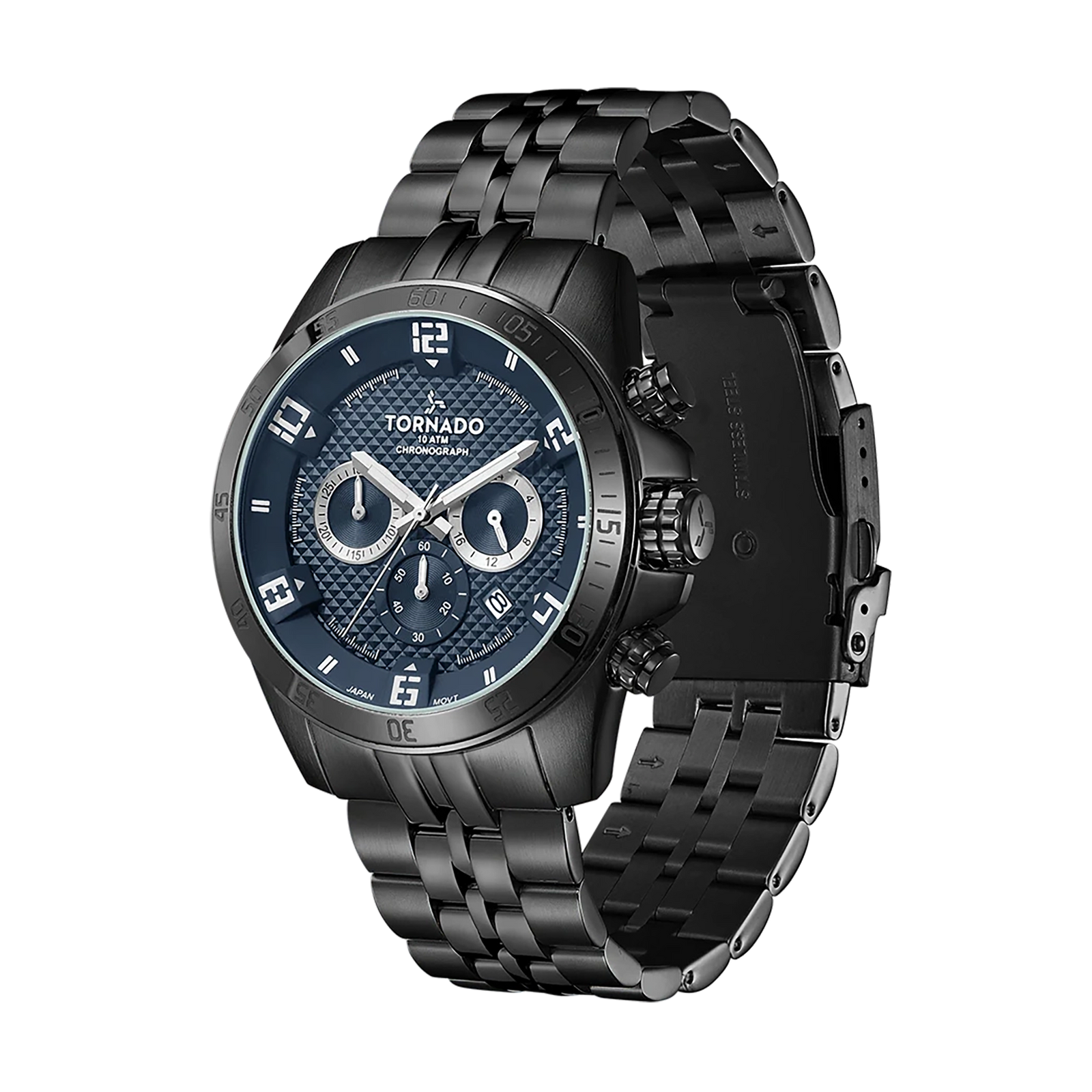Tornado Celestia Chrono Men's Chronograph Watch with blue dial, black case and strap. Japan Quartz chronograph movement, sapphire coated glass, 10ATM water resistant. 3-year warranty included.