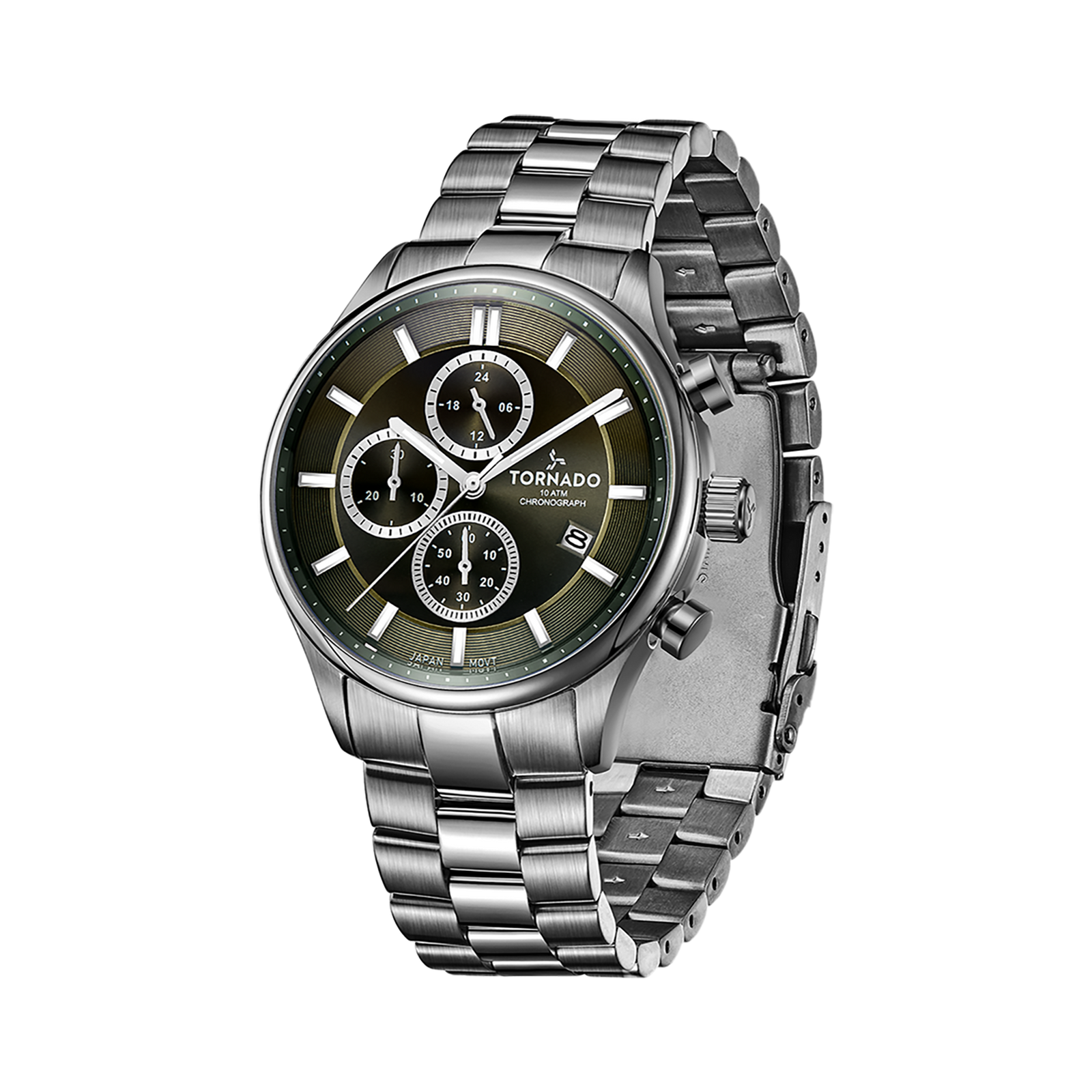 This greyed CELESTIA ELITE presents a contemporary, technical character within the collection. The 42 mm round case is crafted from solid stainless steel and finished with a mix of brushed and polished surfaces that give the watch depth and definition. The matching stainless-steel bracelet continues this contrast, with polished outer links and brushed centre links, secured by a solid deployant buckle for a clean, secure fit. The green dial adds a deliberate contrast against the grey case and bracelet. The chronograph layout is clearly organized with balanced subdials without crowding the dial. Hands and markers are designed for clear visibility, and the sapphire-coated glass provides durable protection while maintaining dial clarity. At its core, the watch is powered by the Miyota JS25 chronograph movement, chosen for its reliability and consistent performance. With a water resistance rating of 10 ATM, the Celestia Elite is suitable for regular daily use and light water exposure. Topping it off, a three-year warranty reinforces Tornado’s assurance on dependable construction.