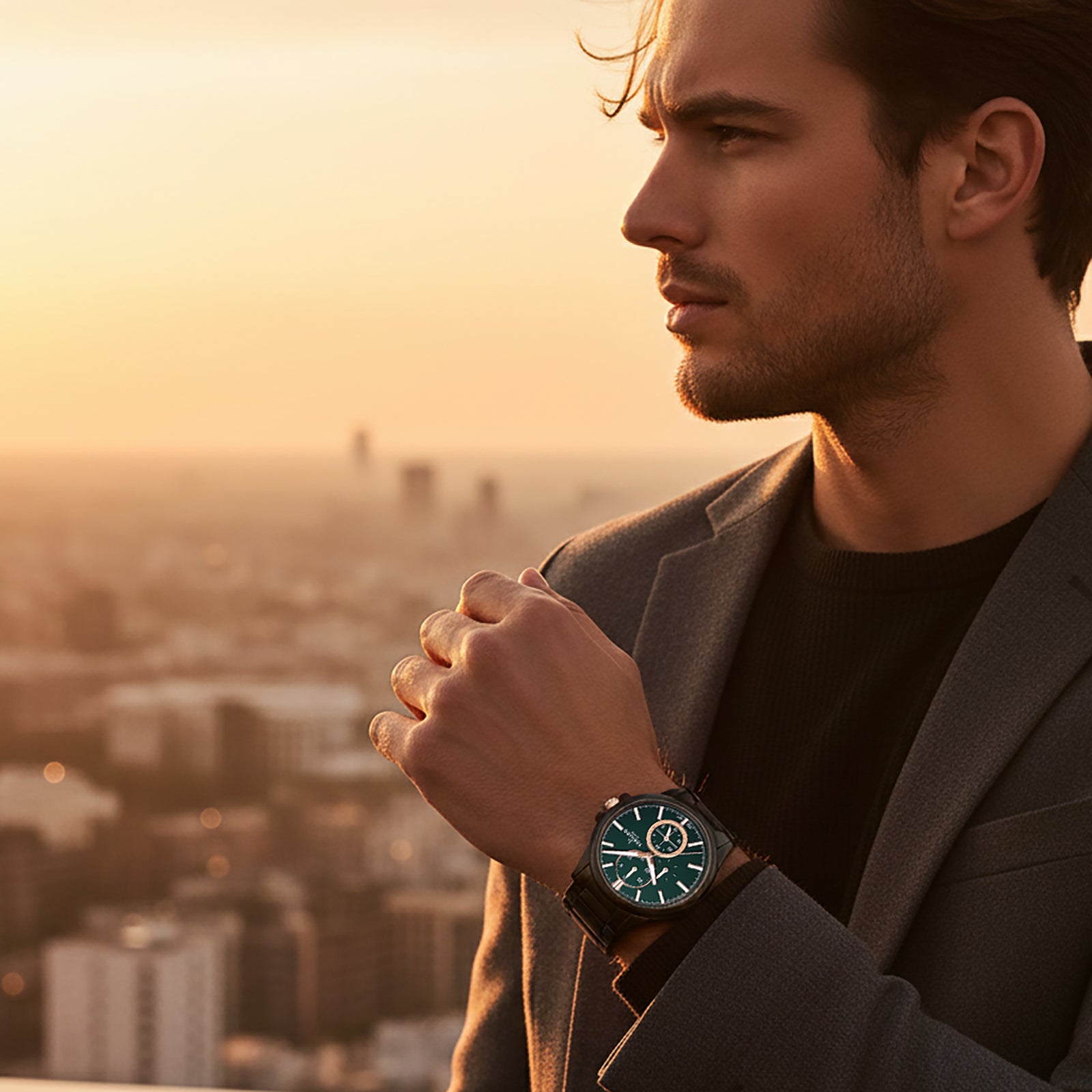Tornado Celestia Elite Men's Multi Function Watch with green dial, gunmetal case and strap. Japan Quartz movement, slight dome sapphire coated glass, 10ATM water resistant. 3-year warranty included.