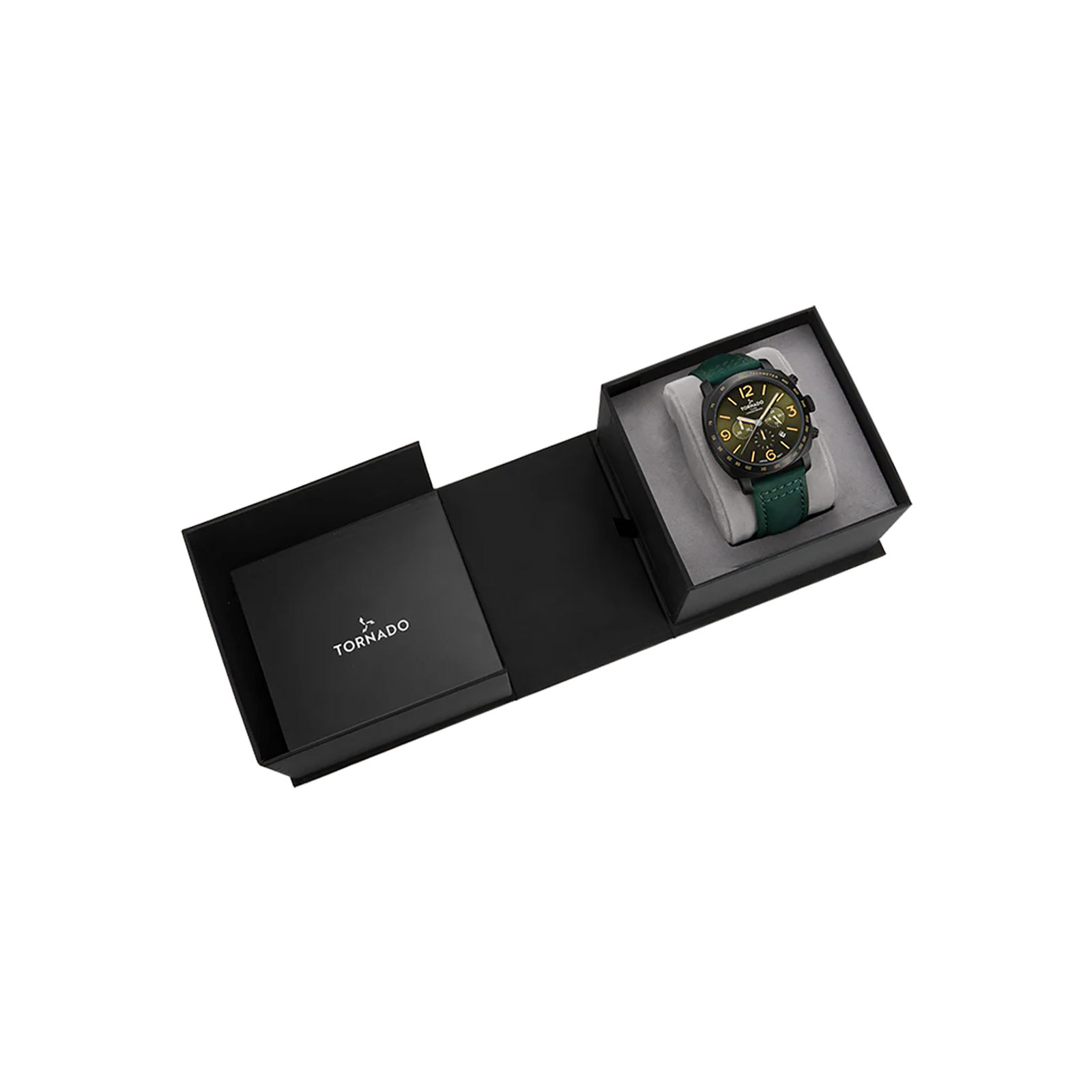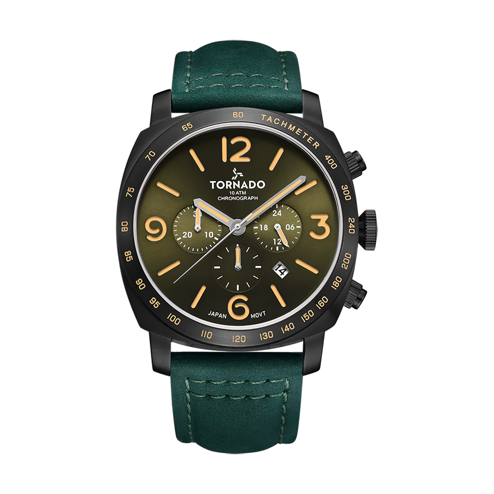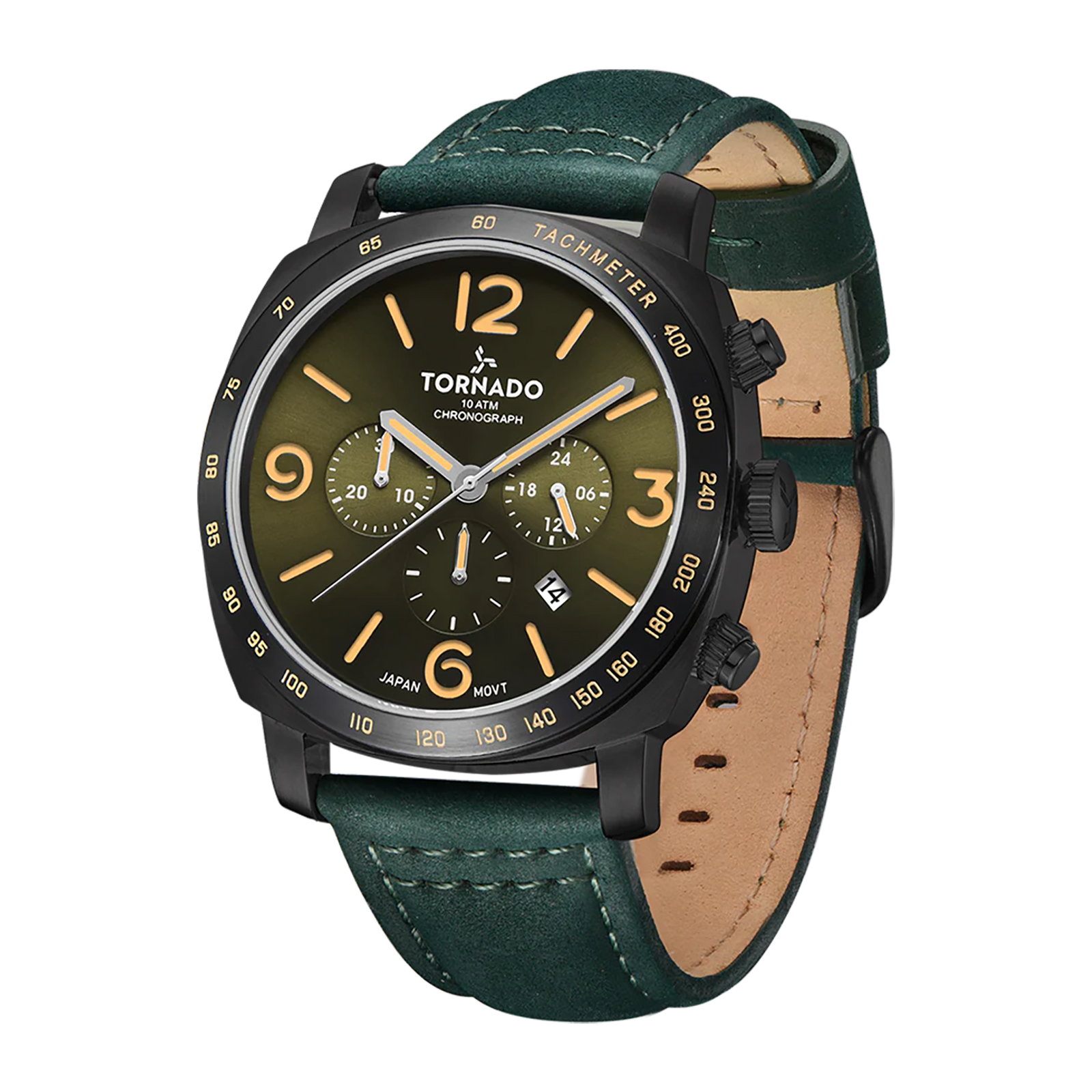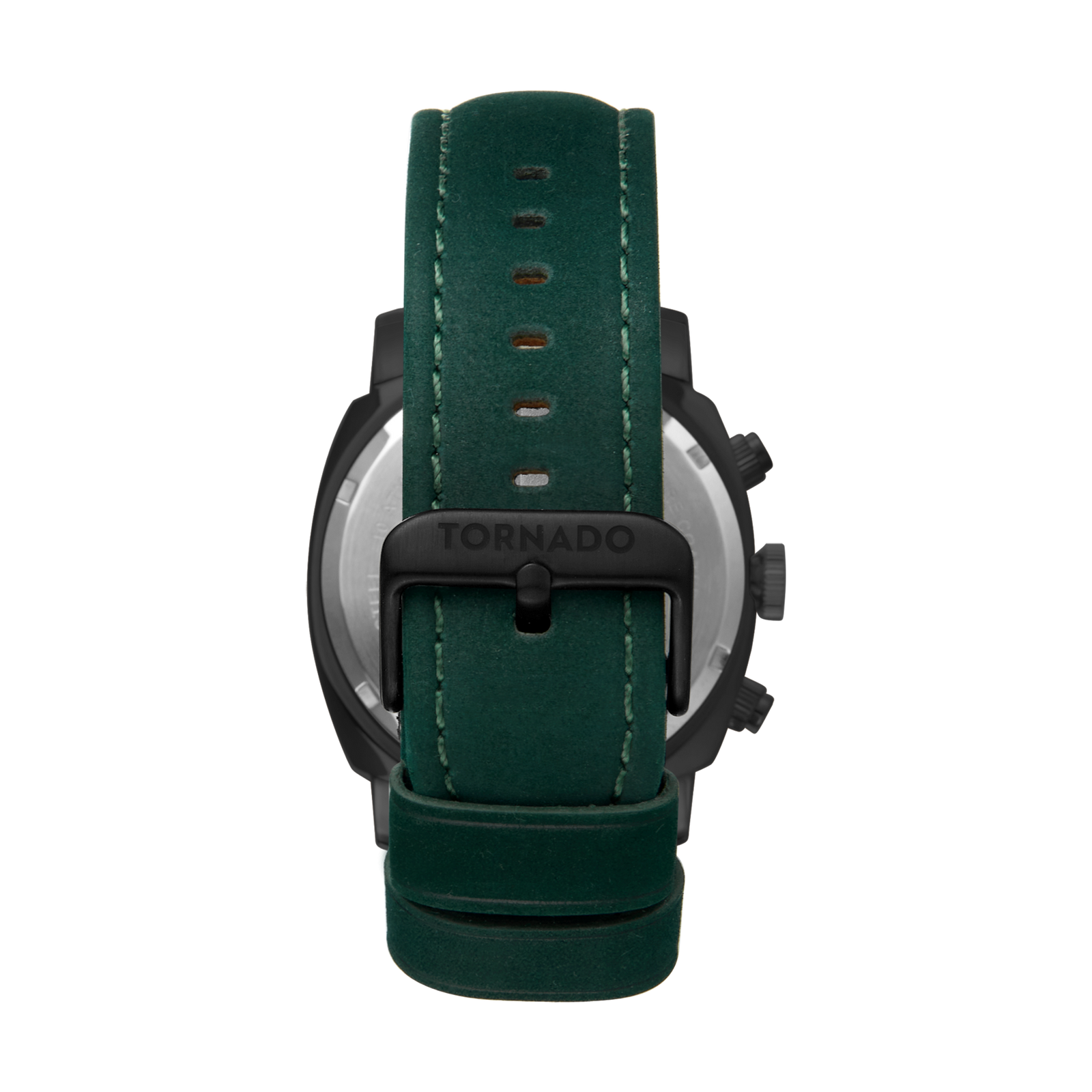 The LUMINA CHRONOSPHERE presents a confident chronograph profile with a distinctive modern colour choice. The 43 mm case is crafted from solid stainless steel with a matte black finish, formed in a square silhouette with a round bezel that adds visual balance and structure. This case design gives the watch a strong architectural presence while maintaining everyday wearability. A green psuede leather strap complements the case with tactile contrast and a natural feel on the wrist. Secured by a tang buckle, the strap keeps the look grounded and functional. The bronze-green dial features a sunburst finish that shifts subtly with the light, adding depth without excess gloss. Luminous hands and markers provide clear legibility in low-light settings, while the chronograph layout remains clean and well-proportioned. Inside, the watch is driven by the Miyota JS25 chronograph movement, while the dial is protected by sapphire-coated glass. With a water resistance rating of 10 ATM and a three-year warranty from Tornado, this model balances durability, precision, and a distinct visual identity.